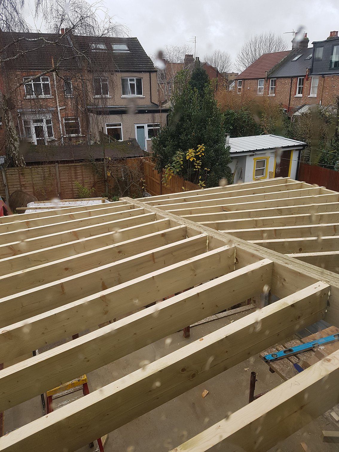 A series of details showing the relationship of elements in the top row. Some images of the extension being built in the bottom row.